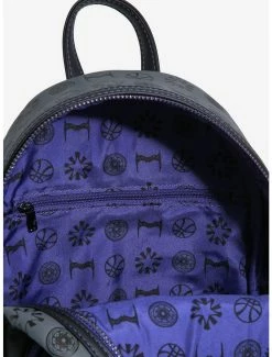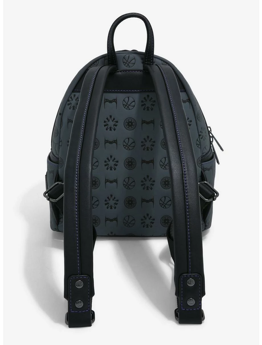 Explore the Multiverse and keep all your belongings secure with this Doctor Strange in the Multiverse of Madness-inspired Loungefly mini backpack. Doctor Strange, America Chavez, Scarlet Witch, and Wong appear on the front of this mini backpack as die-cut appliques in adorable chibi makeovers against an embossed allover print of various icons. This bag also features an enamel brand badge, black-toned hardware, adjustable shoulder straps, and an interior lining pattern.