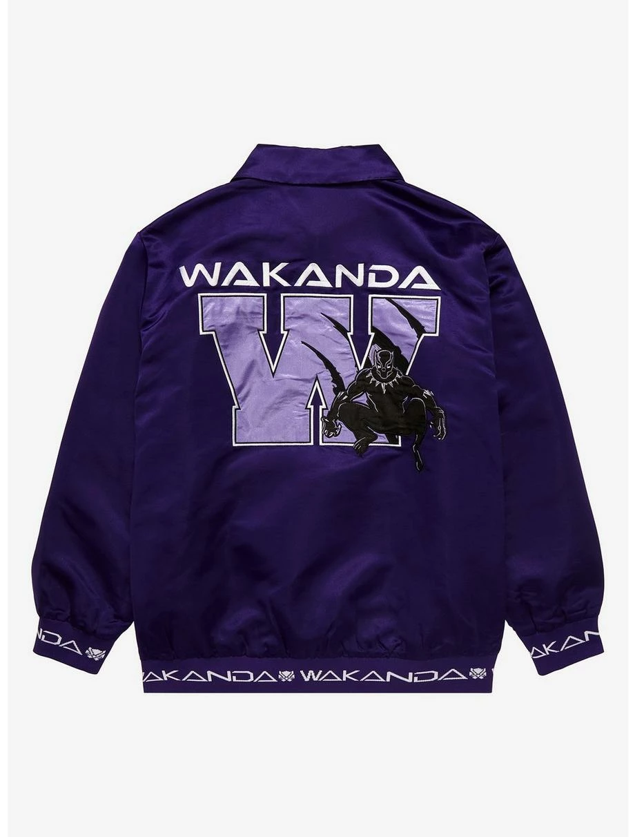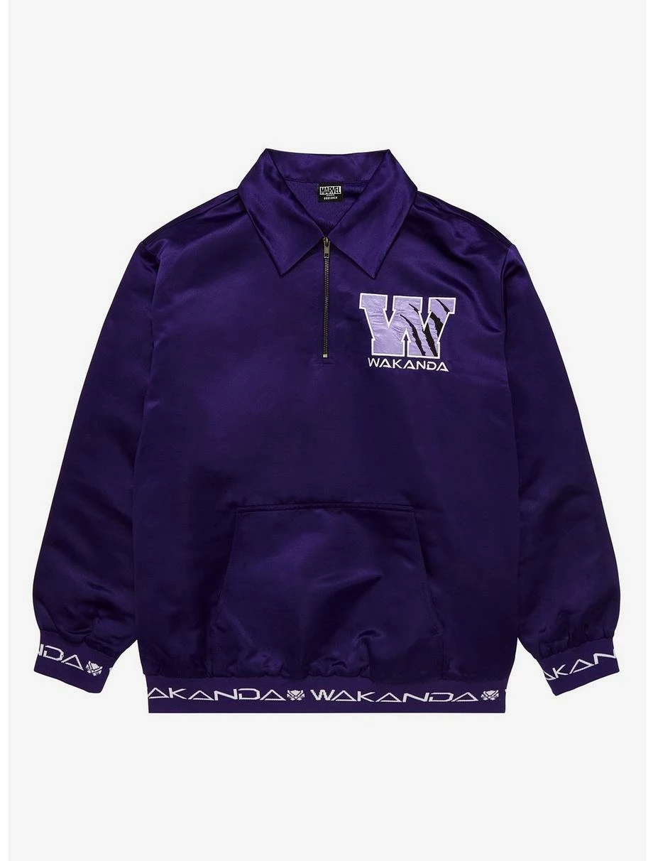 Channel your inner-super hero and rock a look inspired by the Black Panther himself! With a collegiate-styled “W” on the front and back and embroidered and satin details, this sweater features the King from Black Panther, ready to add a Wakandan touch to your wardrobe. Also features quarter-zip front.